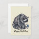 Schöner sitzender schwarzer Bär mit Schmetterlingsbild mit Happy Birthday Text, auf cremefarbenem Hintergrund