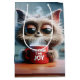 A fluffy, wide-eyed cat holds a steaming red mug with the words "Unleash the Joy".