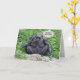 Schimpanse sitzt auf einem Felsen, der auf Grasreed zum humorvollen Geburtstag nibbelt.