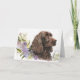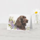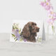 Wasserfarben-Design eines niedlichen Schokoladenkopfhundes spaniel Hundes in einem Frühlingsblumengarten für jedermann Geburtstag.