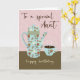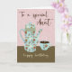 This is a birthday card for an Aunt with a blue coffee pot and cup decorated in folkart influenced flowers, birds and bees. The background is a soft pink designed wallpaper and brown table with the text ‘To a Special Aunt, Happy Birthday.’