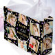 Erstellen Sie eine stilvolle Foto Collage Geschenktasche mit sechs Lieblings-Fotos! Personalisieren Sie die Vorlage mit dem Namen des Empfängers und dem Geburtstagsalter. Ein elegantes Design mit einem überallten Muster aus Konfetti, Sternen und quadratischen Fotografien, perfekt für Familie und Freunde. Druckfarben: lila, schwarze, weiße und Imitate goldene Elemente.