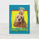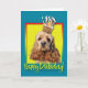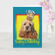 Feiern Sie einen Geburtstag mit dieser skurrilen Cocker Spaniel Dog Grußkarte. Mit einem Kuchen auf dem Kopf wird dieses Design sicher ein Lächeln und ein Giggles bringen! BTW, Dieses Design hat mehrere Versionen, mit verschiedenen Hintergrundfarben. Es gibt auch eine Einladung zu einer Party-Version.