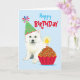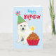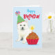 Herzlichen Glückwunsch zum Geburtstag mit diesem niedlichen Design, das ein lächelndes, Party tragendes amerikanisches Eskimo Dog Welpen mit einem Geburtstagskupcake enthält. Text kann leicht geändert werden; klicken Sie einfach auf Anpassen.