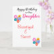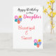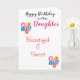 Geburtstagswünsche der Tochter. Personalisieren Sie für jeden. Schön und süß ist auf der Vorderseite in roter Schrift geschrieben. Hübsche, helle Blume in rosa-blau-gelb-orange vor weißem Hintergrund. Verlass eine spezielle Nachricht oder personalisiere sie. Kleinere farbenfrohe Blume und gefederte Blätter auf der Rückseite. Original Artwork and Card Verse Design © TamiraZDesign
