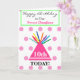 Alles Gute zum Geburtstag. Personalisieren Sie für jeden. Die Tochter ist in hübsch rosa Farbe in einem grünen Rechteck geschrieben. Hellrosa Geburtstagshut mit farbenprächtigen Tassel vor pastellrosa Polka-Punkten auf weißem Hintergrund. Inside links hat Nachricht mit kleinen hübschen Blume in rosa blau gelb grün orange. Verlass den Text außen und innen, oder personalisiere ihn. Große bunte Ballons auf der Rückseite. Original Artwork and Card Verse Design © TamiraZDesign