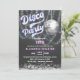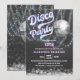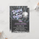 © Socialite Designs Inc. & LICENSORS. Feiern Sie eine Disco Geburtstagsparty und laden Sie die Gäste mit dieser lustigen Retro-Disco-Geburtstagsfeier ein. Das Design umfasst eine silberne Diskokugel, mehrfarbigen Disco-Party und blau-weiße Saitenleuchten als Hintergrund.