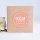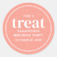 Dieses Design umfasst ein pfirsichfarbenes, modernes Drehbuch, eine minimalistische Take-a-Leckerei-Vorlage, ein kreatives Aufkleber-Label-Gastgeschenk, ein Bonbons-Buffet-Bar-niedlich, ein minimalistisches Minimalkreisskript, ein maßgeschneidertes, elegantes, kreatives Design, eine Leckerei zum Geburtstag, die pink ist, ein niedliche Geburtstag Party, das Mädchen Party