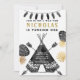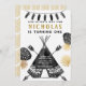 Modern, einfach und kühn - dieses Design ist perfekt für Ihre kleine Abenteurer-Geburtstagsparty. Handgezogener Teepe, Pfeile, Federn und Blätter mit Goldprägung und schwarzer Schrift. Ideal für Ihren wilden!