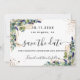 Ein trendiger Save the Date für eine 40. Geburtstagsfeier (oder ein beliebiges Alter). Ein stilvoller weißer Hintergrund mit Eukalyptus, Grünpflanzen, goldenem Blattwerk und Imitaten goldener Glitzer Staub. Personalisieren und fügen Sie Datum, Namen und Text hinzu. Der Text: Save the Date wird mit einem großen angesagten, handgeschriebenen Stilskript mit Swashes geschrieben.