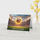 Ein in Flammen verwickelter Fußball fliegt durch die Mitte eines Tors und schafft eine dramatische und energetische Szene in einem Stadion. Alle Texte können geändert werden.