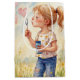 Eine Aquarellskizze eines jungen Mädchens mit blonden Haaren in einem Pferdeschwanz steht in einem Feld und bläst Blasen, die wie Herzen geformt sind. Text kann geändert oder gelöscht werden.