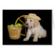 Golden Retriever Welpe mit grünen Äpfeln und Holzrad zum allgemeinen Geburtstag.