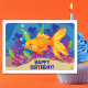 Ein extravaganter Goldfisch in einem Aquarium mit bunten Pflanze und Sand. Die Farben sind orange, blau, lila, braun und rosa. Diese Geburtstagskarte ist perfekt für jeden, der das Hobby des behaltend Fisches Liebe. Innen: Leere