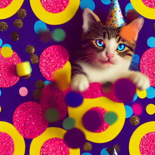 Party mit einem hübschen Kätzchen, das einen Geburtstagshut in einer Konfetti-Dusche trägt.