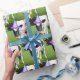 Holsteinkühe mit lila Geburtstagshut auf einer grünen Weide