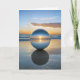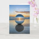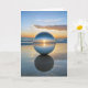 Glaslinsenkugel auf einem Strand mit Sonnenaufgang an der Küste reflektiert. Inside text ist bearbeitbar.