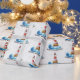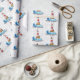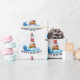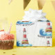 Rot-weiß gestreifter Leuchtturm mit blauer Welle, Happy Birthday Text, Möwen auf einem weiß gekalkten Holzboden.