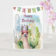 Aquareller Llama mit herzförmigen Gläsern, Flaggengarten und einem Geburtstagshut mit Wüstenlandschaft im Hintergrund. Im Inneren ist ein Geburtstagswunsch und ein Lama mit bunten Ballons