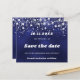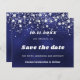 Ein Save the Date für eine 50. Geburtstagsfeier (oder jedes Alter). Ein marineblau gefärbter Hintergrund. Die blaue Farbe ist ungleichmäßig. Dekoriert mit Imitaten silberne Sterne. Für ihn und sie.