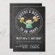 Ein fröhlicher Cartoon Typ, der 50 Bierflecken wirft, auf einer schwarzen Tafel mit weißem Text. Alle Texte können bearbeitet werden, auch geeignet zum Beispiel 21. Geburtstag, 30., 40., 60. u.a.
