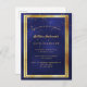 Eine trendige, moderne 50. Geburtstagskarte für Männer, Typ und Männer. Ein dunkelblauer, marineblauer Hintergrund. Die blaue Farbe ist ungleichmäßig. Mit einem goldenen Rahmen und goldenen Konfetti-Imitat sprinkle, goldfarbene Buchstaben. Vorlagen für Ihre Party-Informationen. Zurück: schlichtes Postkartendesign.