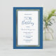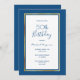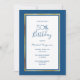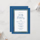 vorne: Klassischer blauer Hintergrund mit goldfarbenem Imitat und weißem Rahmen. Einfach und elegant! Vorlagen für einen Namen und Party Details. Der Name und der Text: 50. (oder jedes Alter) Geburtstag werden mit einem handgeschriebenen Stift geschrieben, blaue Buchstaben. Ideal für einen Winter, einen Frühling oder eine nautische Sommergeburtsfeier! Zurück: Klassisch blauer Hintergrund.