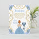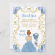 This birthday thank you card features an elegant gold frame, a beautiful princess with red hair and a dusty blue dress, flowers and a balloon.