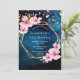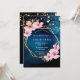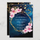 Eine tropische Blüte unter den Sternen 50. (oder jedes Alter) Geburtstagsfeier Einladung mit rosa Hibiskus Blume, Grün und einem Imitat goldene geometrische Rahmen. Ein dunkelblauer Nachthimmel mit Vollmond und goldenen Sternen als Hintergrund. Vorlagen für einen Namen, der mit einem modernen Stilskript geschrieben wurde, Vorlagen für Ihre Party-Informationen. Weißer Text. Ideal für einen Sommer-, Pool- oder Strandurlaub! Zurück: blauer Himmel und goldene Sterne als Hintergrund.