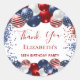 Aufkleber für eine 18. Geburtstagsparty (oder jedes Alter). Weißer Hintergrund. Mit patriotischen bunten Ballons in Rot-Blau und Weiß dekoriert. Blau-rote Glitzern. Personalisieren und einen Namen hinzufügen. Text: Danke.
