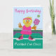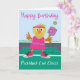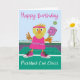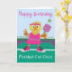 This birthday card is for anyone who loves pickleball. It features a yellow chick playing pickleball on a court. The chick is dressed in a pink dress with a pink headband and stylish pink hi-top gym shoes. The card’s message reads, “Happy Birthday, Pickleball Cool Chick!”