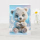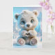 Ein niedlicher Eisbärenkub mit großen, ausdrucksstarken Augen und Pfoten in Herzposition sitzt in einer schneebedeckten Landschaft, umgeben von glitzernden Eiskristallen für ein Nichte. Text kann geändert werden.