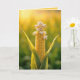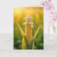 Ein Maiskolben steht in einem sonnenbeleuchteten Feld, seine Kernen sind lebhaft gelb und mit einer unerwarteten Popcornblüte übersät