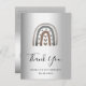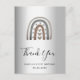Eine Dankeschön-Karte für einen 21. Geburtstag (oder jedes Alter). Ein Imitat silber metallisch aussehender Hintergrund. Dekoriert mit einem modernen abstrakten, minimalistischen Regenbogen mit Herz. Auf der Vorderseite große schwarz gefärbte handgeschriebene Schrift und der Text: Vielen Dank, Ihr Text, Titel und ein Datum.