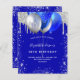 Ein königlich blauer Hintergrund. Dekoriert mit Imitaten silberne Glitzer Tropfen malen Tropflook, Glitzern und Ballons. Personalisieren und fügen Sie einen Namen und Party Details hinzu. Der Name wird mit einem handgeschriebenen Stilskript geschrieben.
