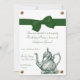Eine schöne Einladung zum Tee-Party einer Dame oder zum Geburtstag. Es zeigt ein Vintages Bild einer grünen Teekanne unten und eine Grafik eines grünen Schleifens und Bogens oben. Die Grafiken von Goldstriden verdecken die Ecken. Sehr elegant!