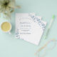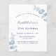 Bitte beachten Sie, dass diese Einladung auf Flyer Papier und sehr dünn ist. Umschläge sind nicht enthalten. Für dickere Einladungen (gleiche Gestaltung) besuchen Sie bitte unseren Shop. Weiße, mit dusy blauen Eukalyptus-Stielen dekorierte Kulissen. Personalisieren und fügen Sie einen Namen und Party-Details hinzu. Zurück: staubiger blauer Hintergrund.
