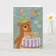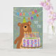 This is a fun birthday card with a bear, wearing a party hat, and a big round colorfully decorated birthday cake with lots of candles. There is a banner of flags spelling out 'birthday wish.’