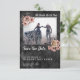 Dunkel schöne Save the Date Karte mit Till Death Do Us Part Sprichwort, dornige Zweige, Spinne auf Rose und Federn, mit einem schwarzen Diamantmuster Hintergrund. Skripttypografie. Personalisieren Sie mit Ihrem eigenen Foto.
