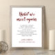 Dieses elegante, dunkelrote und schwarze Gedenkzeichen, das bis zum Erscheinen des Gedichts "We Meet Again" in Blau berührt, ist eine wunderschöne Art, sich an den Liebsten der Ansammlung "Celebration of Life" zu erinnern und zu ehren. Passen Sie Ihren Text am unteren Rand an.