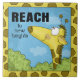 Der Kopf einer Cartoon-Giraffe stürzt durch den Baumgipfel und die kühne Beschriftung lautet: "Erreiche neue Höhen". Manche Bilder sind von einem Giraffenhautmuster, einem schwarzen Rand oder gar keinem Rand umgeben. Originelles Design von Christie Black von Kreationen aus dem Herzen.