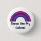 Round Button mit Bisexualität Regenbogenstreifen in Rosa, lila und Blau; Bi Stolz Flaggendesign auf weißem Hintergrund, Vorlagentext "This Are My Colors", von Pinkbrickroad