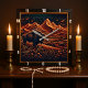 Diese Abbildung zeigt einen mächtigen Bison stehend in einem Feld mit einer dramatischen Bergkette dahinter. Das Kunstwerk wird mit einer geflochtenen Textur und einer auffallenden Farbpalette aus tiefschwarz und einer leuchtenden, kupferähnlichen Orange gerendert. Die Szene ist nachts Set unter einem Sternenhimmel mit einem großen, glühenden Mond oder Himmelskörper, was ihm ein mystisches Gefühl gibt.