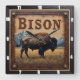Diese Abbildung zeigt einen dunklen, bemalten Lederhintergrund mit einem majestätischen Bison oder Büffel in einem Feld. Hinter dem Gebirge ist eine Bergkette zu sehen, die im warmen, erdigen Glühen eines Sonnenuntergangs badet. Der untere Teil des Bildes enthält den Text "BISON".