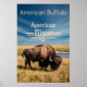 Ein großer amerikanischer Bison weidet sich auf einem Feld großen Grases in der Nähe eines Flusses, mit einem blauen Himmel und weißen Wolken im Hintergrund.