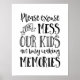 'Bitte entschuldigen Sie das Durcheinander, unsere Kinder sind damit beschäftigt, Erinnerungen schwarz-weiß drucken Plakat moderne handgeschriebene Typografie in Schwarz-Weiß. Ideal für ein Kinderzimmer oder Spielzimmer und Anzüge in einem monochromen Stil.