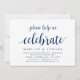 Moderne Rustikale, Navy Blue Script Einladungskarte (mit Kartentitel: Bitte helfen Sie uns zu feiern). Es ist perfekt für Ihren Hochzeitsfeier Empfang / Post Hochzeitsfeier Party. Fügen Sie Ihre Daten in passender schwarzer Schriftart / Schrift hinzu.