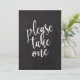 Ein elegantes Hochzeitszeichen, das den Text "Bitte nehmen Sie eins" in einem extrovertierten Script-Schriftart enthält, die Pinseltextur fügt ein spontanes und spielerisches Gefühl hinzu. Die Hintergrundfarbe kann nach Ihren Wünschen und Vorlieben personalisiert werden, bitte kontaktieren Sie mich, wenn Sie eine spezielle Anfrage haben.