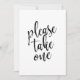 Ein elegantes Hochzeitszeichen, das den Text "Bitte nehmen Sie eins" in einem extrovertierten Script-Schriftart enthält, die Pinseltextur fügt ein spontanes und spielerisches Gefühl hinzu. Die Hintergrundfarbe kann nach Ihren Wünschen und Vorlieben personalisiert werden, bitte kontaktieren Sie mich, wenn Sie eine spezielle Anfrage haben.