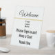 Herzlich willkommen bei Ihren Besuchern mit diesem markierten Begrüßungszeichen. Die Vorlage enthält ein Anzeigebild, das Sie durch Ihr Logo ersetzen können. Dieses weiße Zeichen hat schwarzen Bildschirmtext. Außerdem kann der Anzeigetext bearbeitet werden, um den gewünschten Text anzuzeigen. Text anzeigen lautet: Willkommen Bitte anmelden und Platz haben Danke